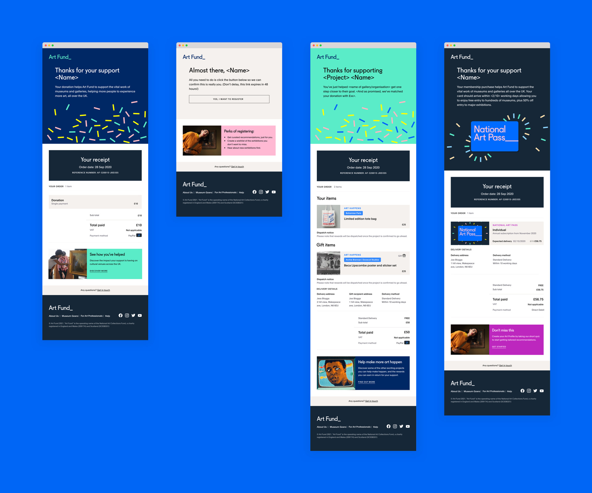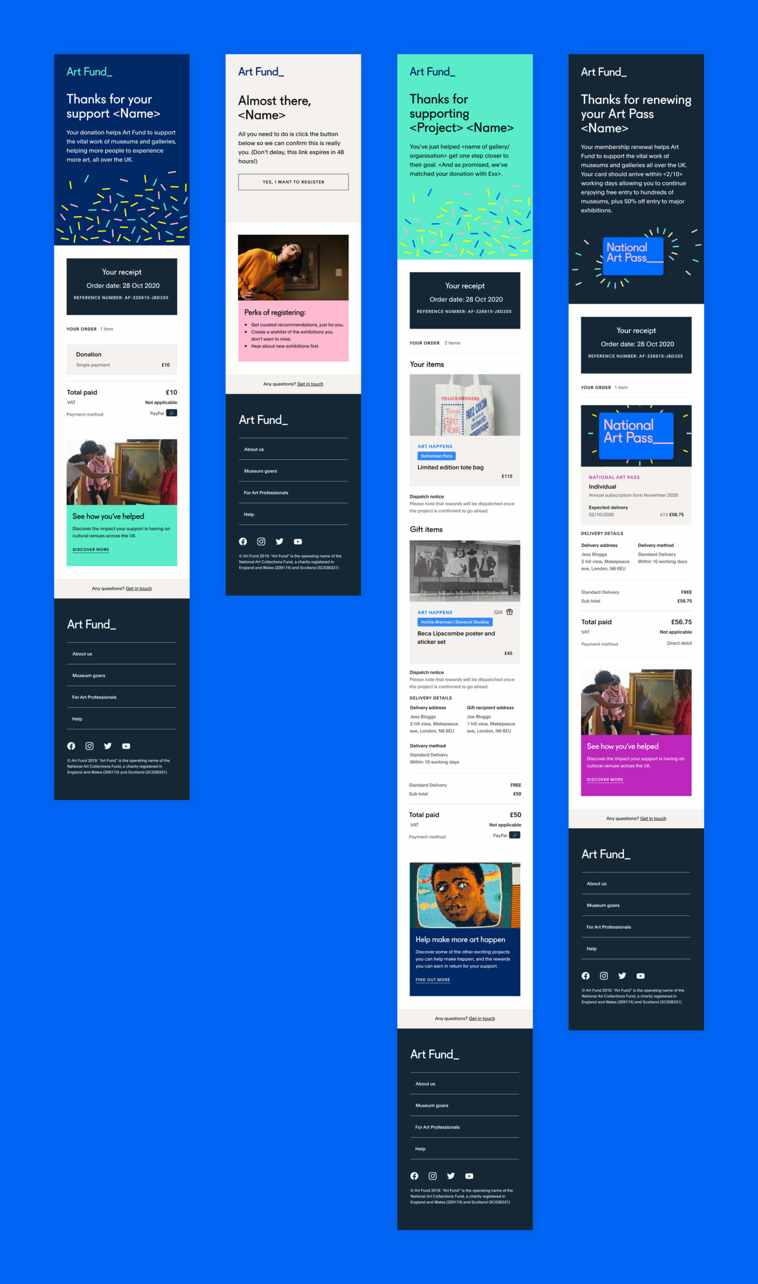 Together with the new website, the trigger emails form a part of the online customer journey experience. The concern was that although very functional, the emails were dry and lacking the same flavour as the website. The task was to redesign them in a way that would maintain their functionality yet incorporate the new Art Fund personality and relevant inspiration.